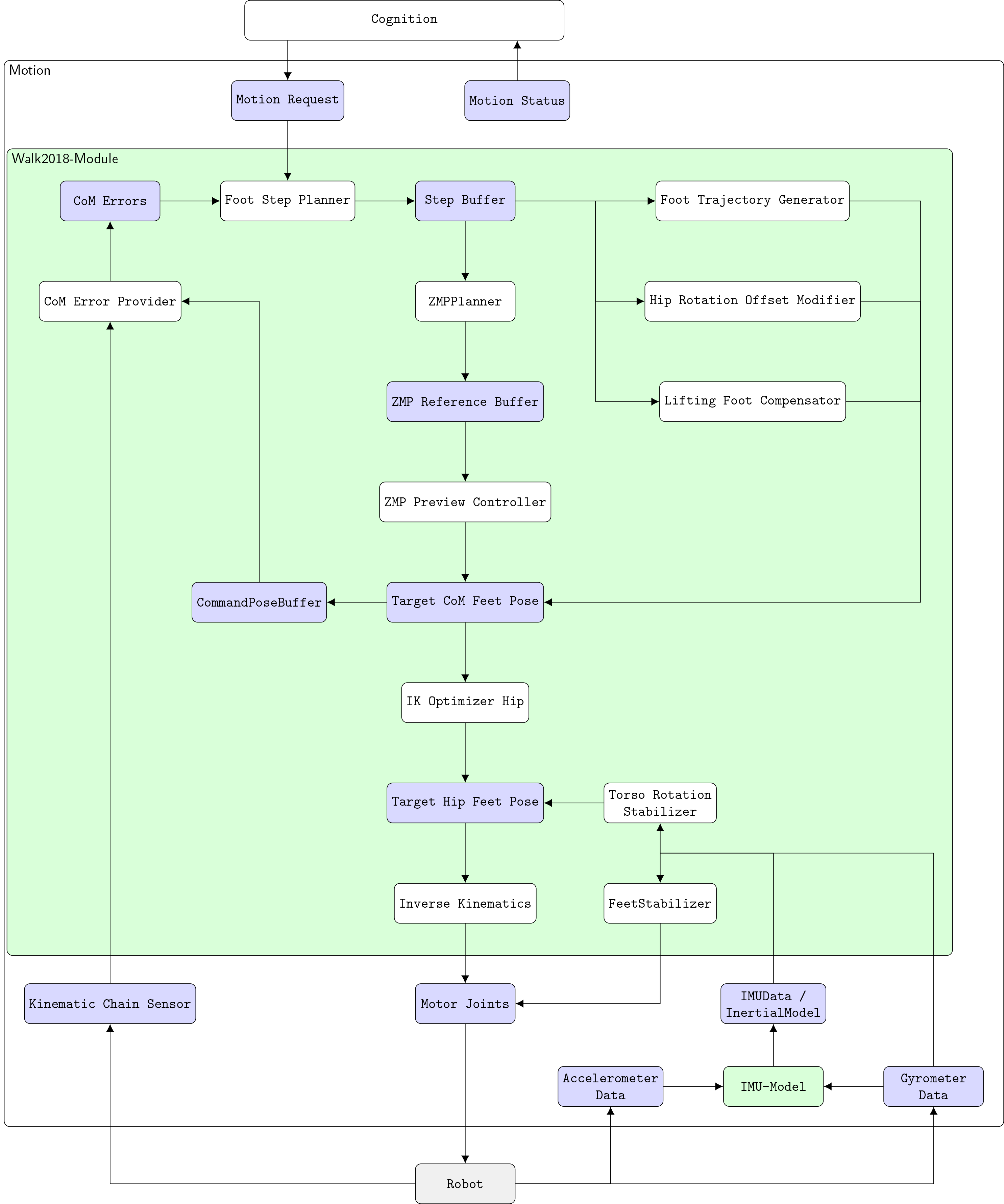The algorithm we use to accomplish a walking motion can be subdivided into four components: the path planner, the step planner, the preview controller and stabilization.